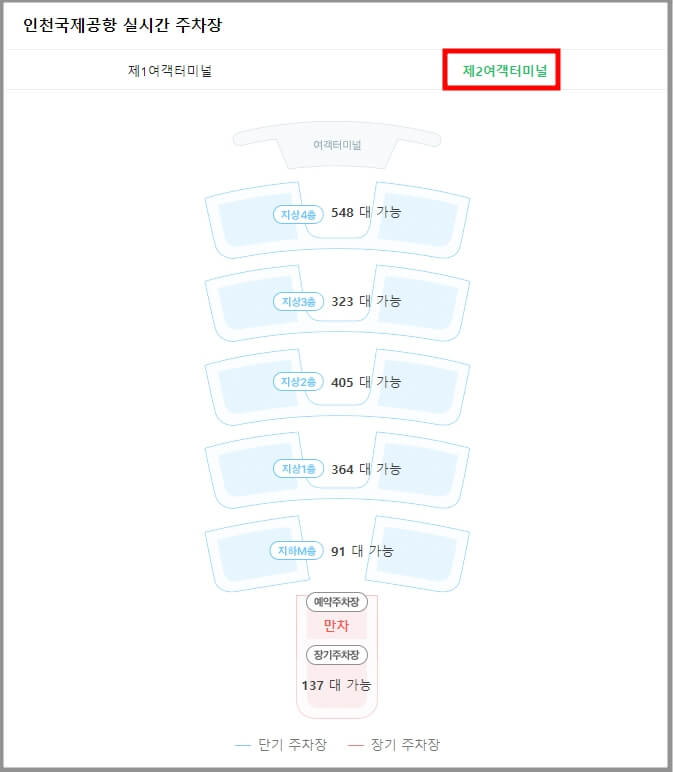 제1여객터미널과 제2여객터미널이 분리되어 있으므로 이용하는 여객터미널을 선택한 후 주차가 가능한 층수와 대수를 미리 확인하면 주차가 매우 편리합니다.